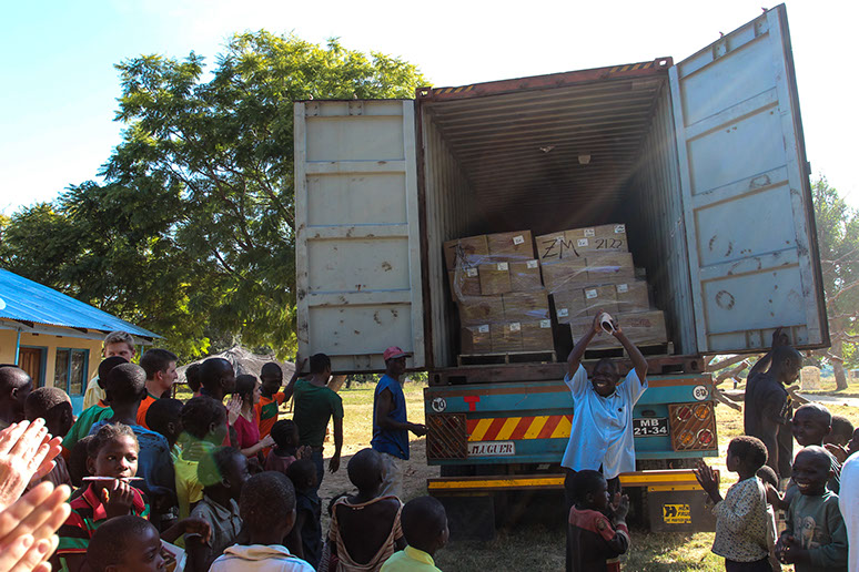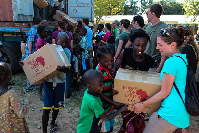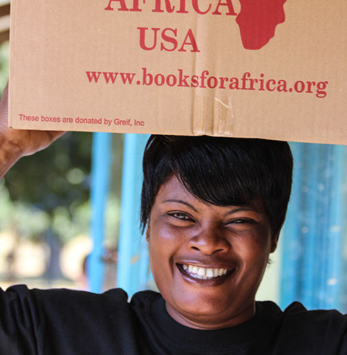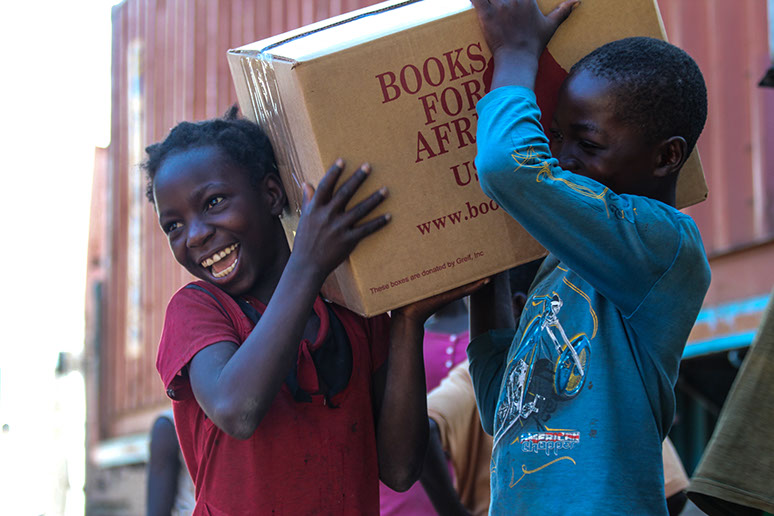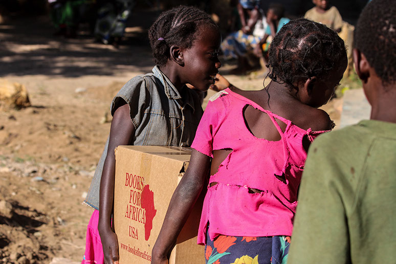 Mama Katendi, a Gonzaga-in-Zambezi cultural guide, helps unload books